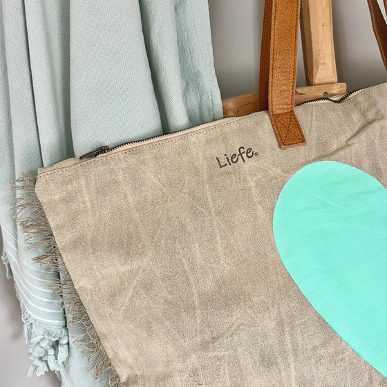 Each bag is truly unique: The eco-friendly hand-painted hearts , small sewn-on patches, and the Liefe stamp on the back tell their own story. Inside, a sturdy cotton lining with practical compartments awaits all your essentials – including a zip pocket for your valuables.