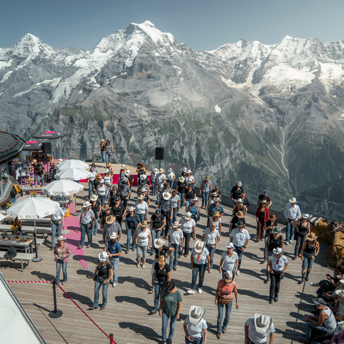 Line Dance auf 2’677 Metern über dem Meer – umgeben von Eiger, Mönch und Jungfrau – auf einer sonnigen Holzterrasse, die zum Tanzen einlädt.